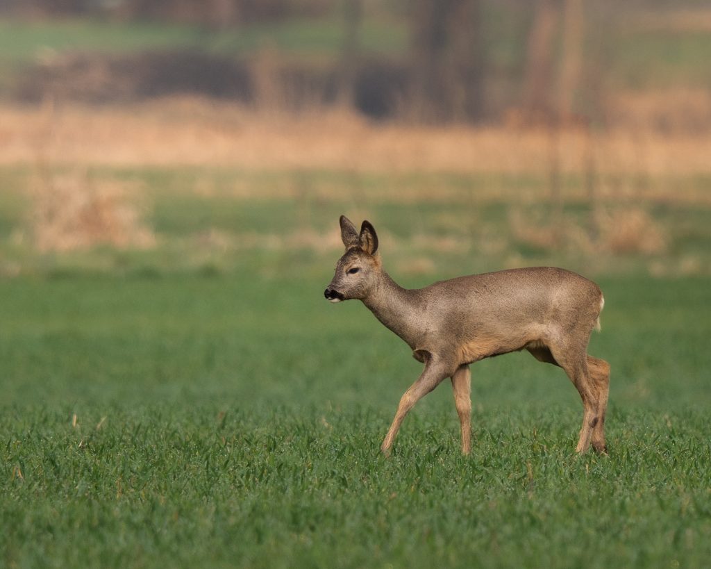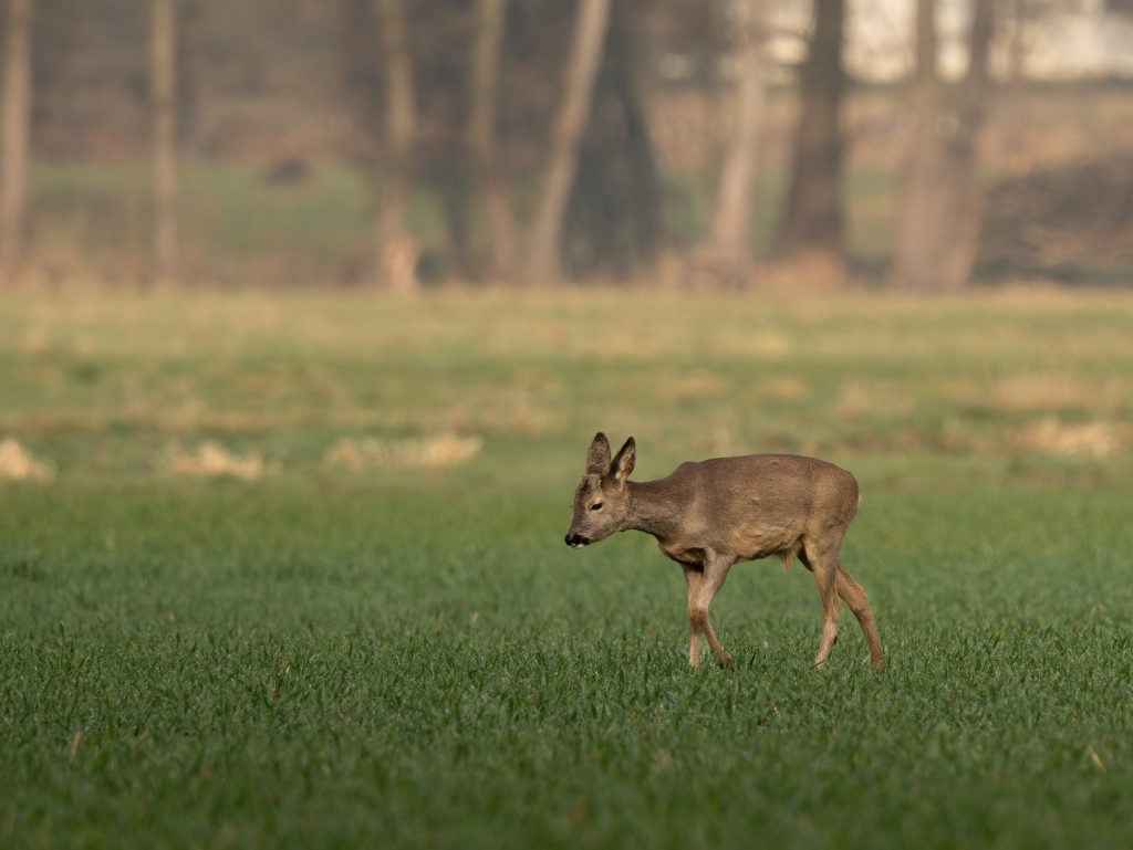 Diesmal war ich schon um 5:30 Uhr unterwegs, lange bevor die Sonne aufging. Ich positionierte mich getarnt am südlichen Rand eines Feldes, hinter mir ein Waldstück, und wartete. Leider schreckte irgendetwas die Gruppe auf, und sie verschwand auf der andere Seite des Feldes hinter einer Biegung. Ich war schon fast bereit aufzugeben, als sich ein einzelnes Reh wieder zeigte. Es kam hinter einem Busch hervor, etwa 400 Meter entfernt. Der Wind wehte in meine Richtung, sodass es mich nicht wittern konnte. Langsam bewegte ich mich am Feldrand entlang in seine Richtung. Bei etwa 200 Metern musste ich meine Position beziehen, um nicht entdeckt zu werden. Das Reh schaute immer wieder aufmerksam in meine Richtung.