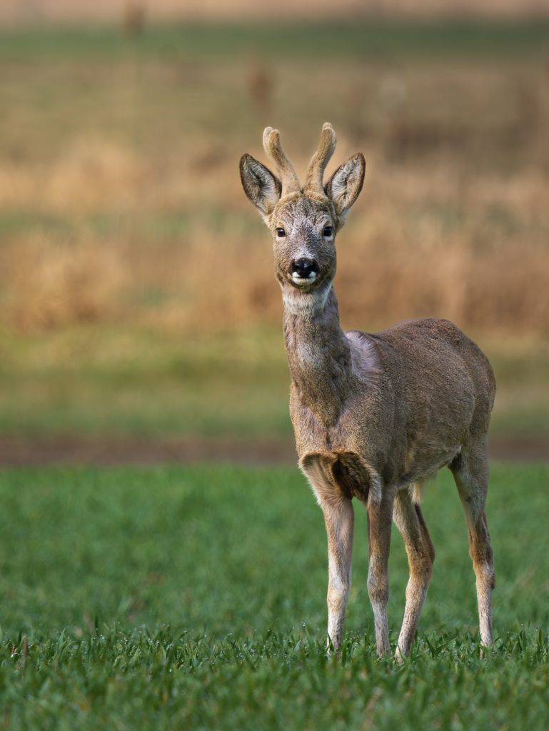 Ich machte es mir so bequem wie möglich, saß in meinem Tarnanzug am Feldrand neben einem Strauch und wartete – gefühlt eine Ewigkeit, tatsächlich etwa 1,5 Stunden. In dieser Zeit kehrten nach und nach immer mehr Tiere der Gruppe zurück, darunter auch der prächtige Rehbock, der anscheinend der Anführer war. Ich konnte die jungen Böcke bei ihren spielerischen Kräftemessen beobachten, während die anderen Rehe ganz entspannt grasten. Die Gruppe bewegte sich langsam, aber stetig in meine Richtung, bis sich der Rehbock in Bewegung setzte und direkt auf mich zulief. Sie überquerten das Feld von Nord nach Süd, und das in einer Entfernung von nur etwa 30 Metern!